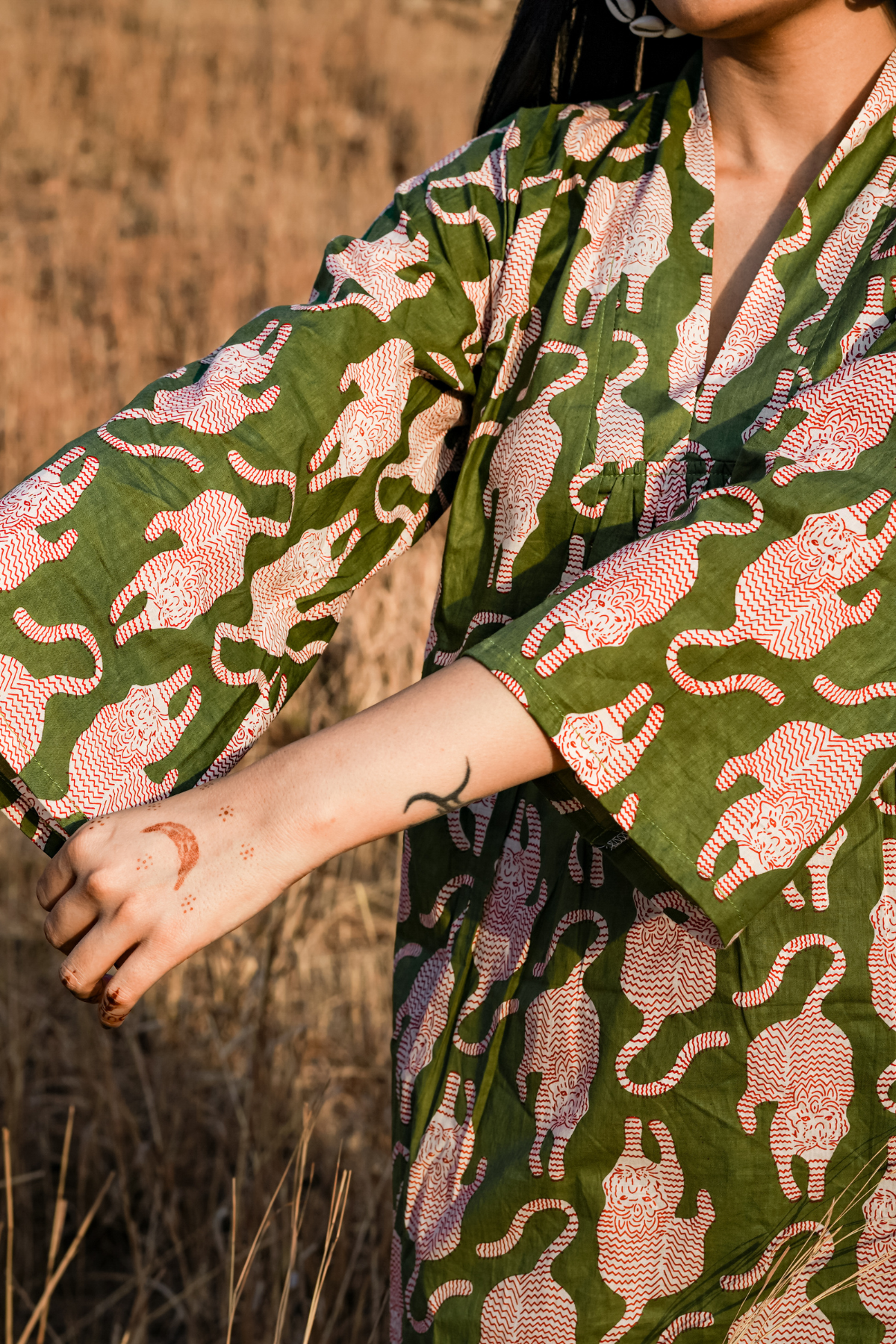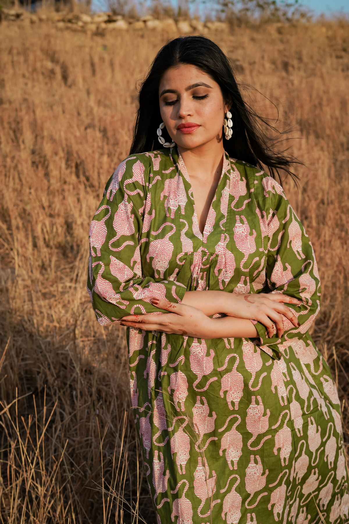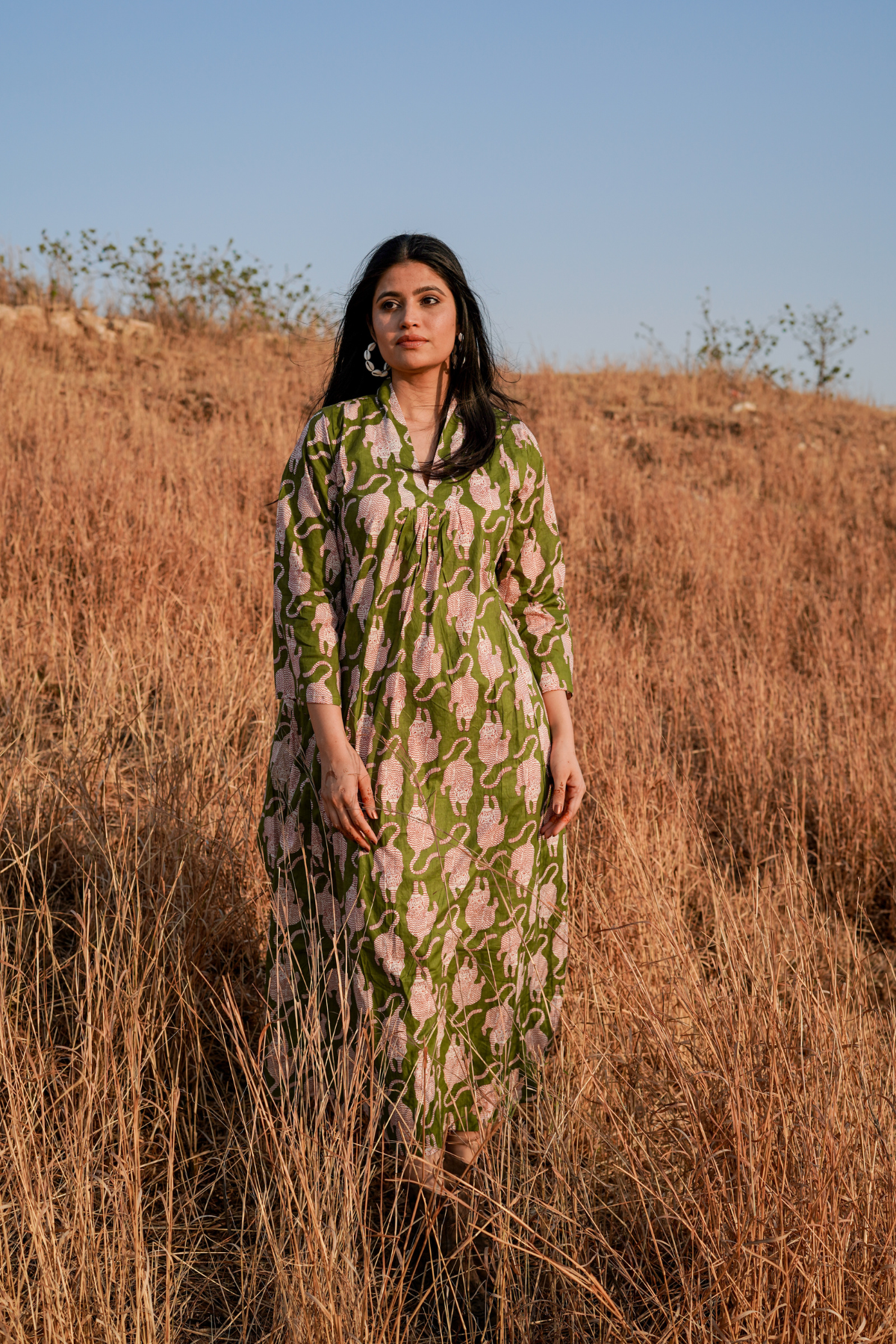 Featuring a Green Handcrafted Cotton Midi Dress with Red Cat Motifs.