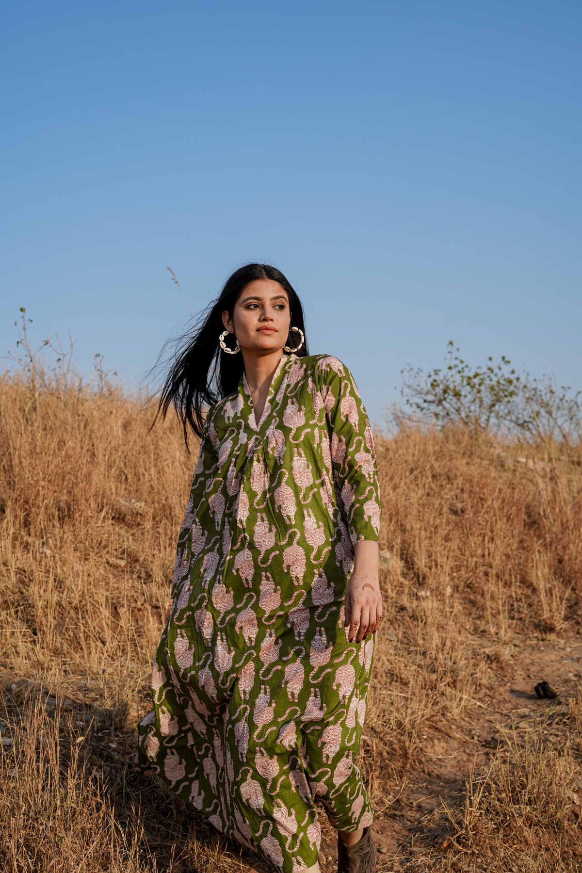 Designed with a flattering V-neckline, 3/4th-length sleeves, and concealed side pockets, the design balances sophistication with comfort. Each detail— from the subtle print placement to the easy, fluid fall— reflects thoughtful craftsmanship meant for the modern woman who values artistry in simplicity.
