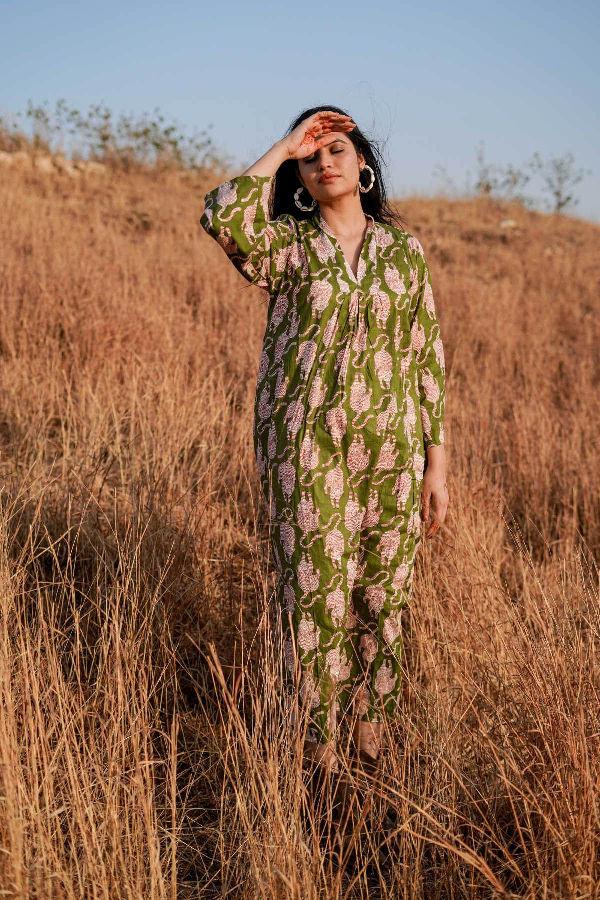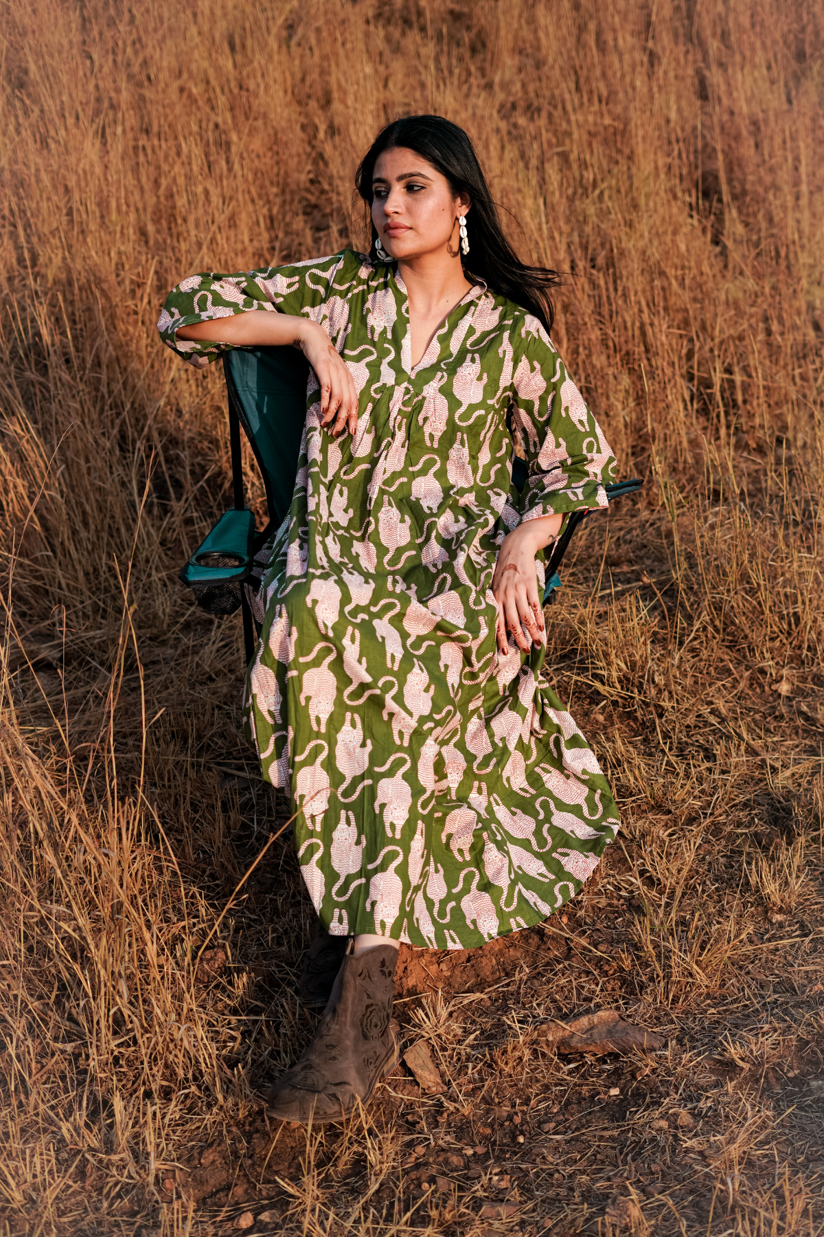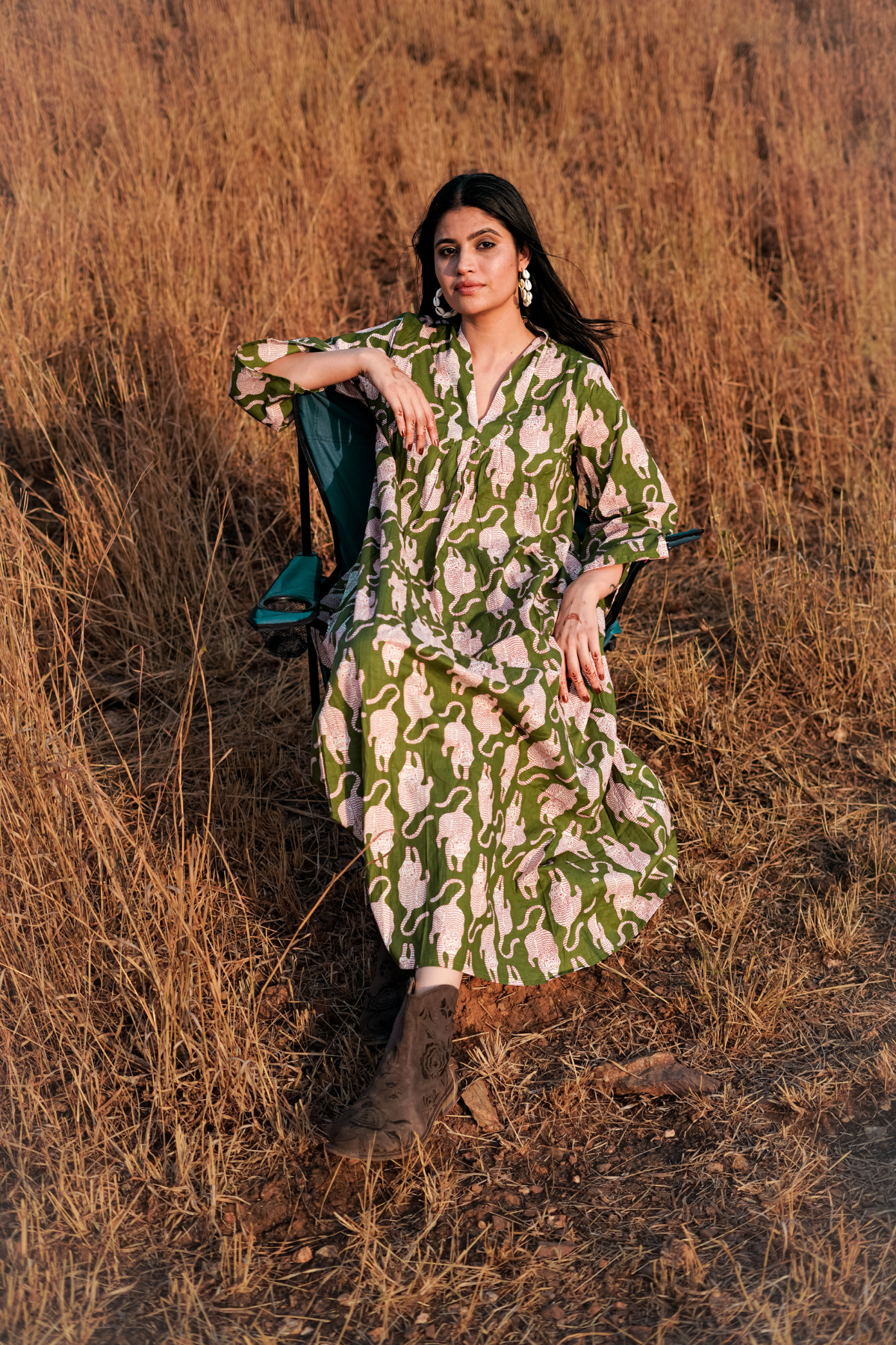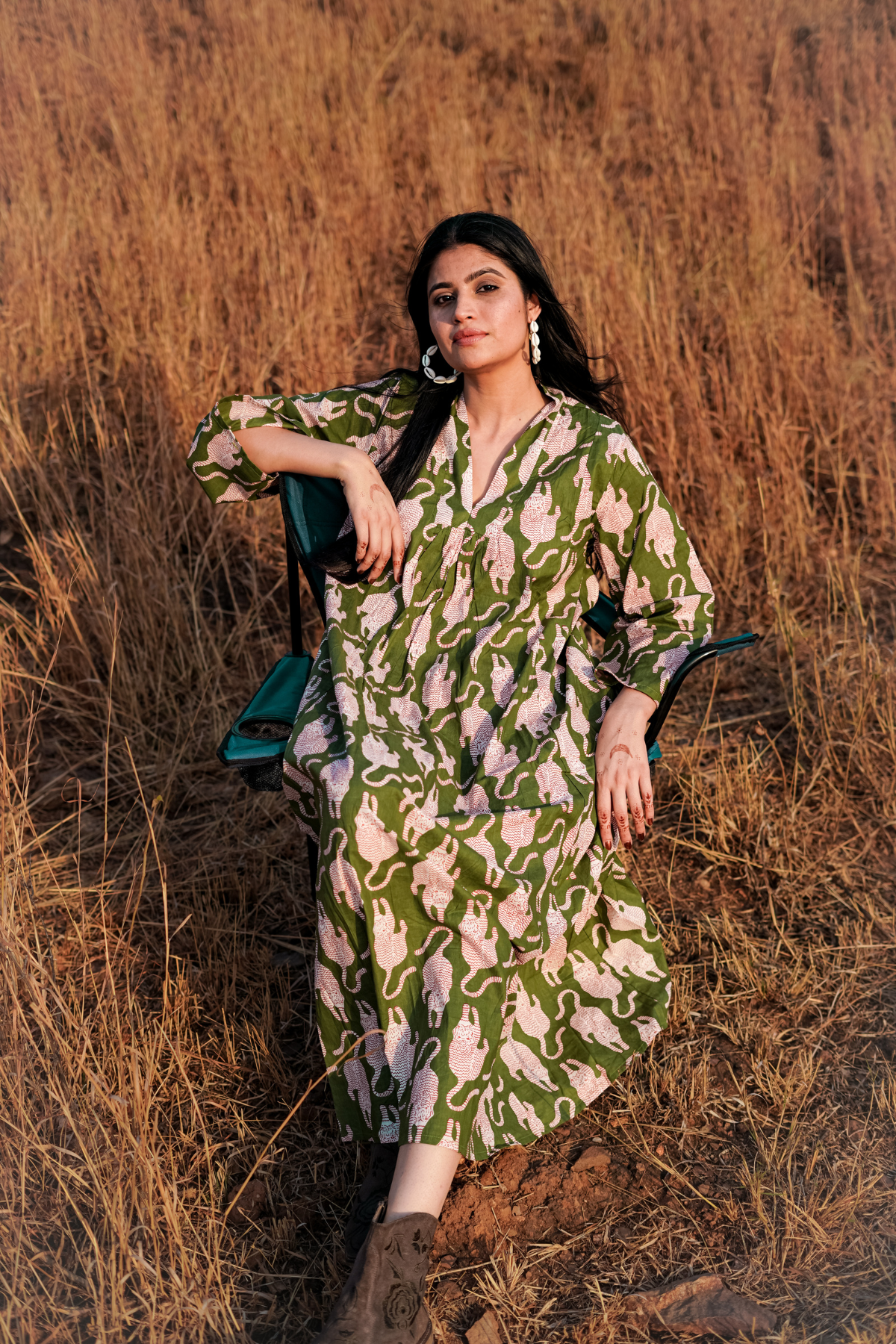 Elevate your everyday elegance with this green midi dress, exquisitely crafted in pure, breathable cotton. Adorned with delicate red cat motifs, this piece captures a whimsical charm while maintaining a refined, boutique appeal. The flowy silhouette drapes gracefully, flattering every form with effortless poise.