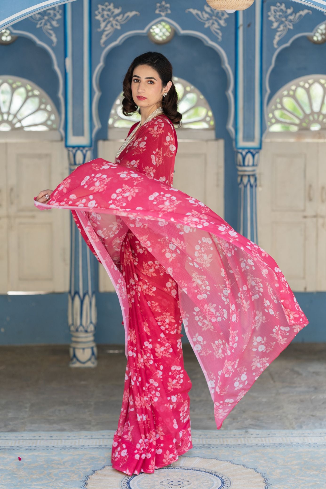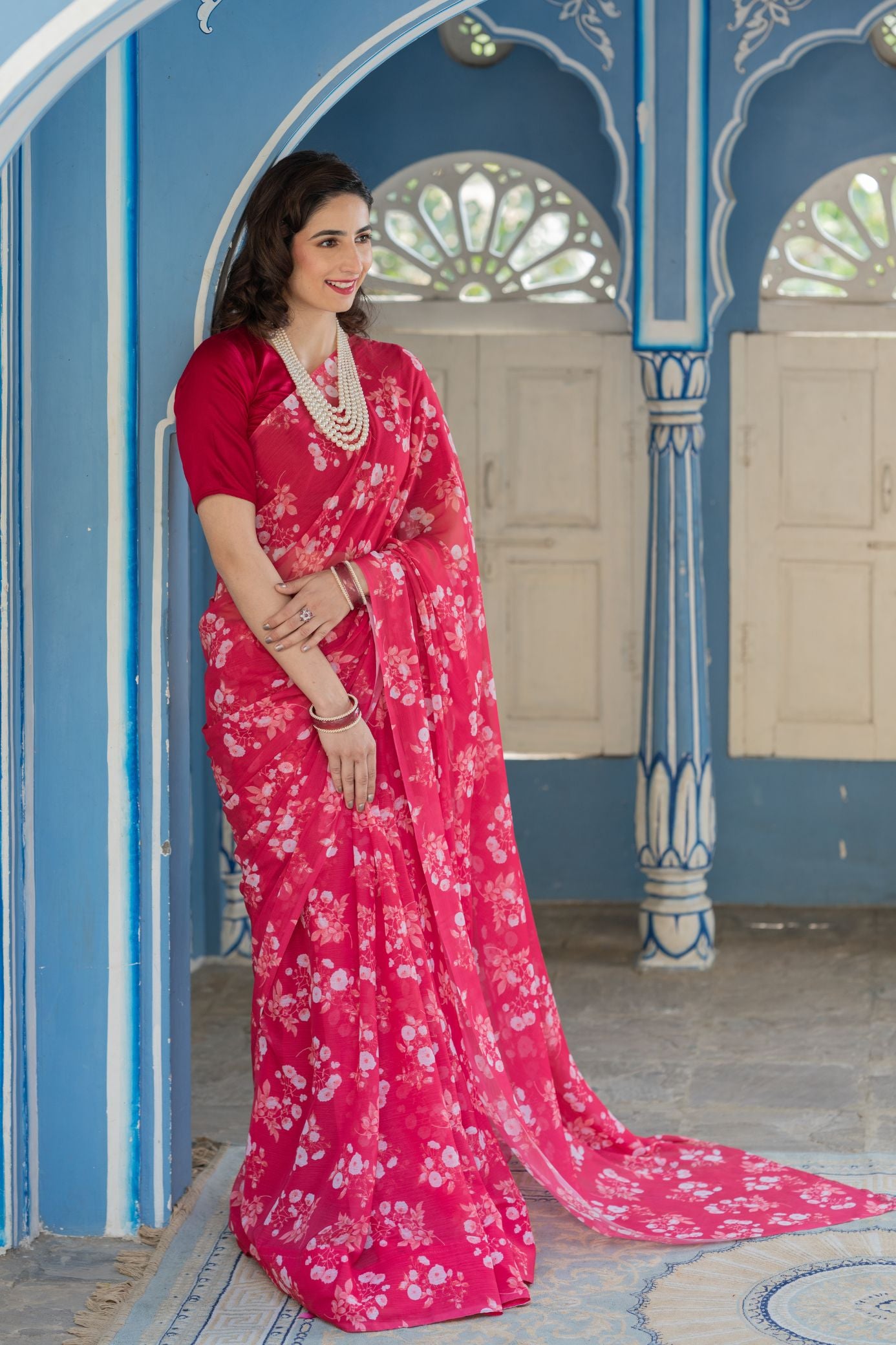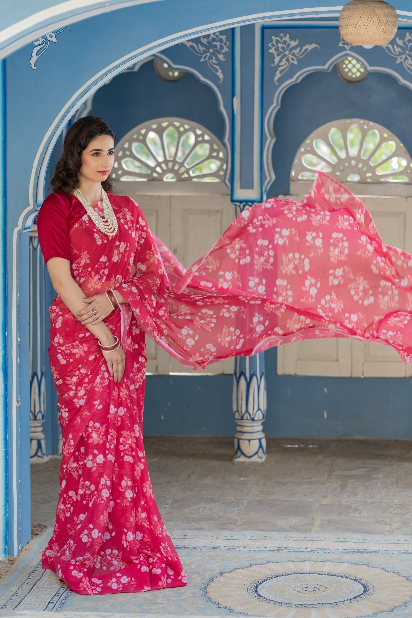 - Elevate your style with our stunning Red French Chiffon Saree, a graceful embodiment of classic charm and contemporary elegance.